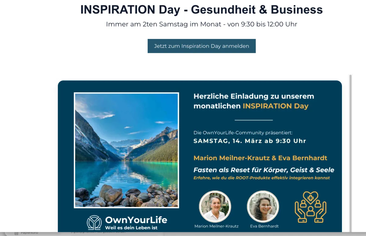 Eigene Landingpage für den monatlichen Inspiration Day der OwnYourLife Community, mit wechselnde Themen zur Gesundheit und Business.
